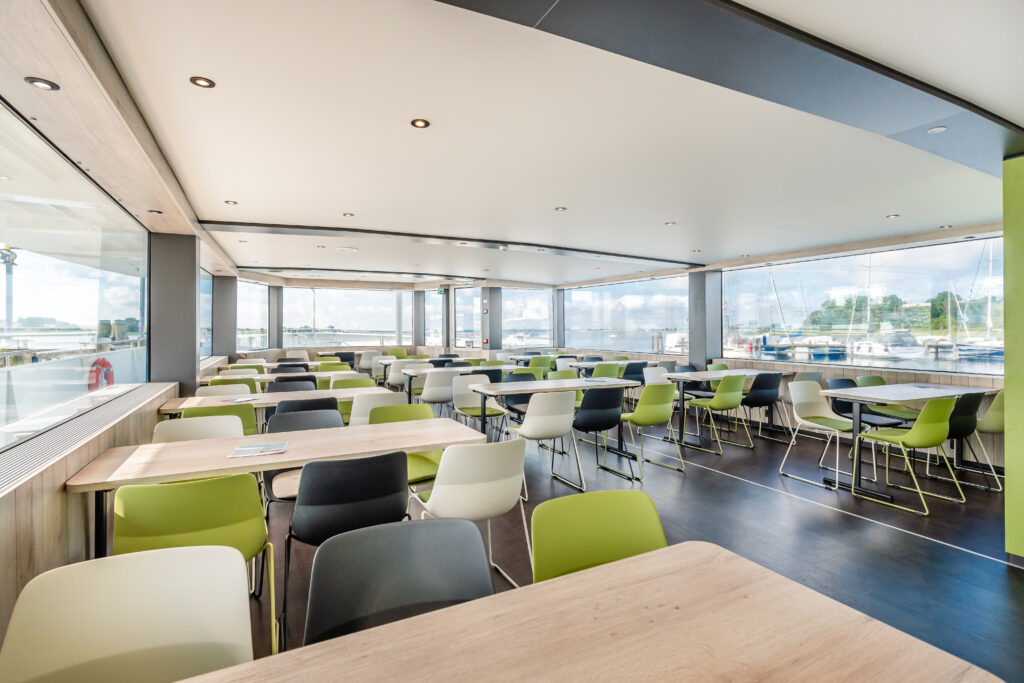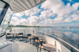 Sie bietet jede Menge Raum für effektives Arbeiten und die Bestuhlung an Bord ist flexibel: Tische und Stühle können nach Ihren Wünschen platziert werden, Haupt- und Oberdeck sind räumlich getrennt und werden genau nach Ihren Bedürfnissen bestuhlt. So können Sie auf dem Oberdeck konferieren, während auf dem Hauptdeck zum Lunch oder zum lockeren Brainstorming geladen wird.
